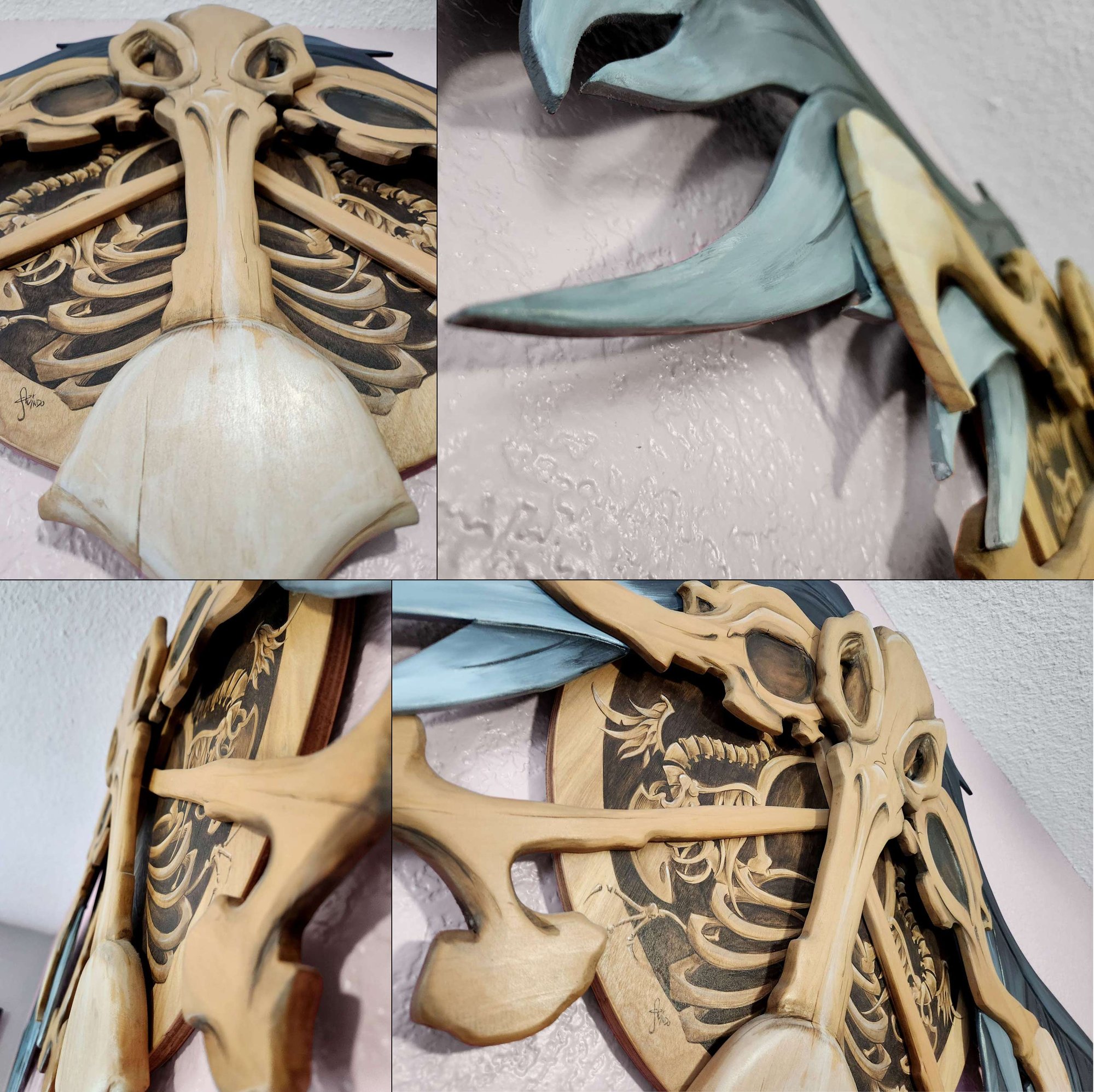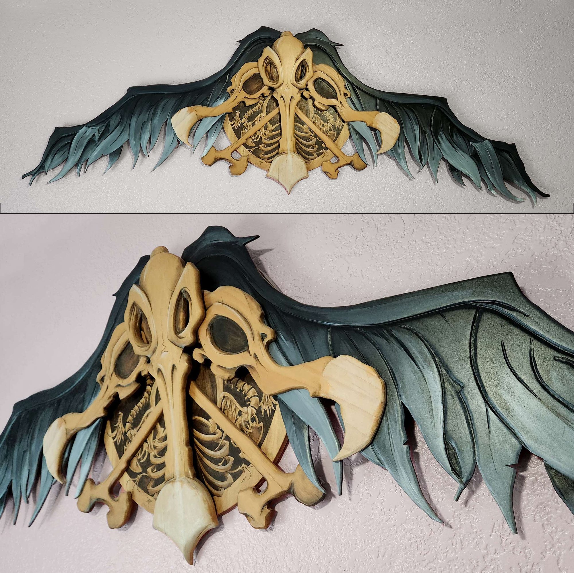 6'x2' hand carved original art. The skulls and cross bones are carved wood. Rib cage background is painted stain on plywood and the wings are hand carved MDF. (Wings are removable for shipping.)
